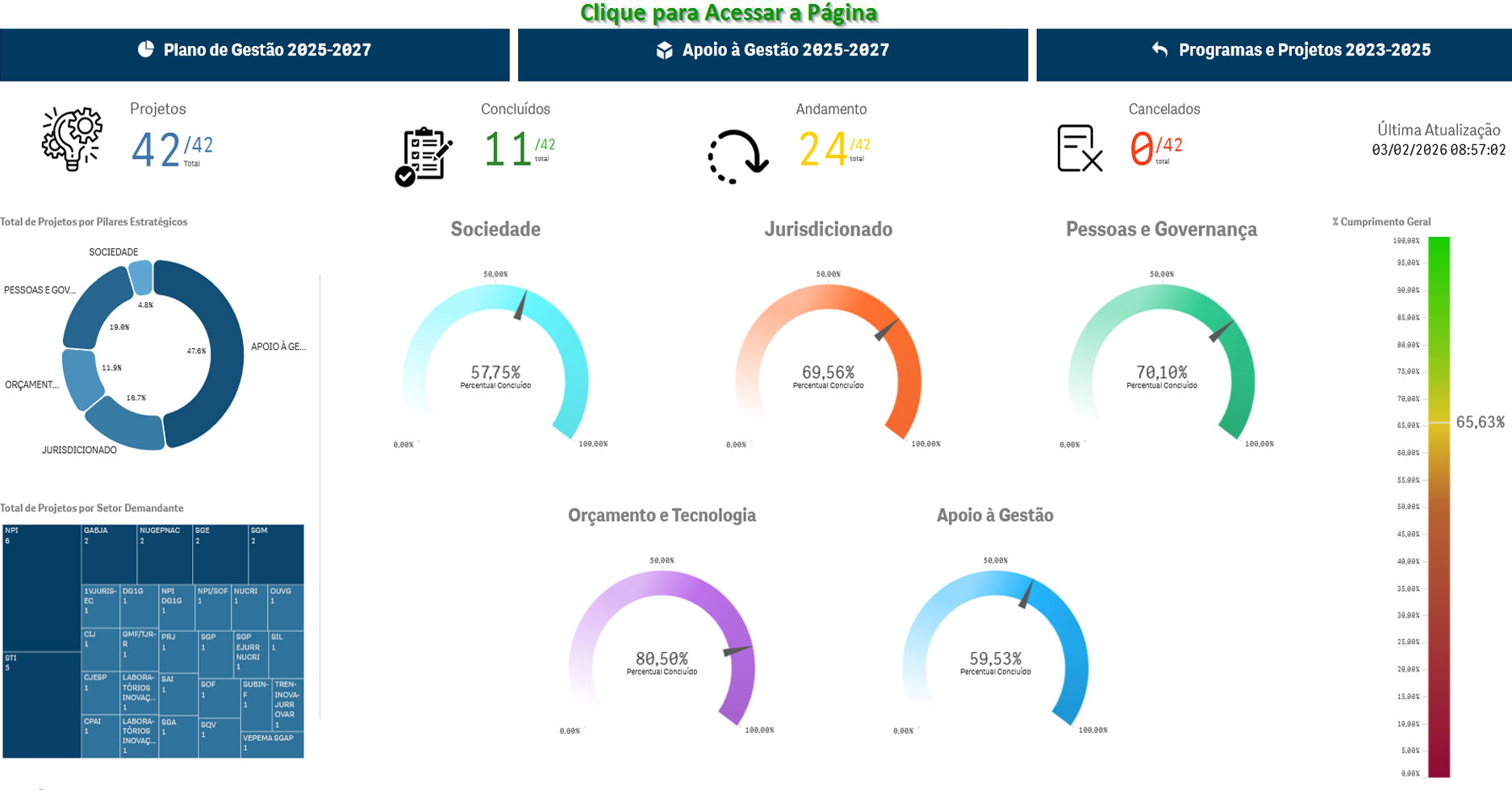 O painel exibe, de forma dinâmica, dados atualizados sobre a execução dos projetos, incluindo objetivo, entregas, status, percentual de andamento, vínculo estratégico, escopo e orçamento, além de outras informações atualizadas.