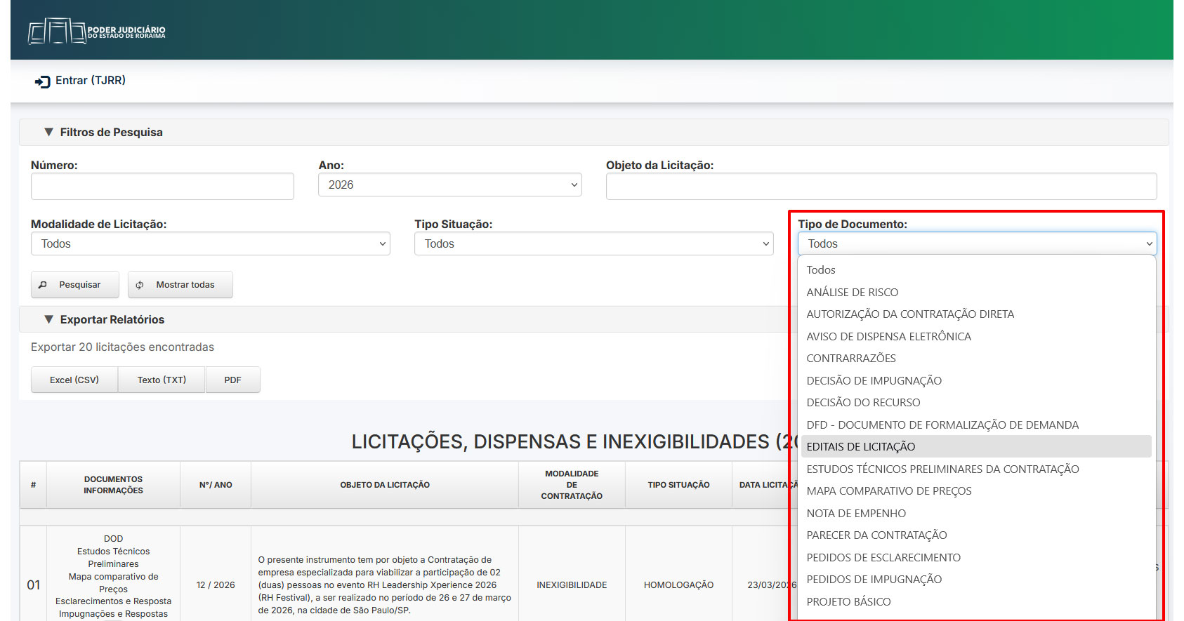 Ao acessar o sistema, no campo "TIPO DE DOCUMENTO", escolha a opção "EDITAIS DE LICITAÇÃO"