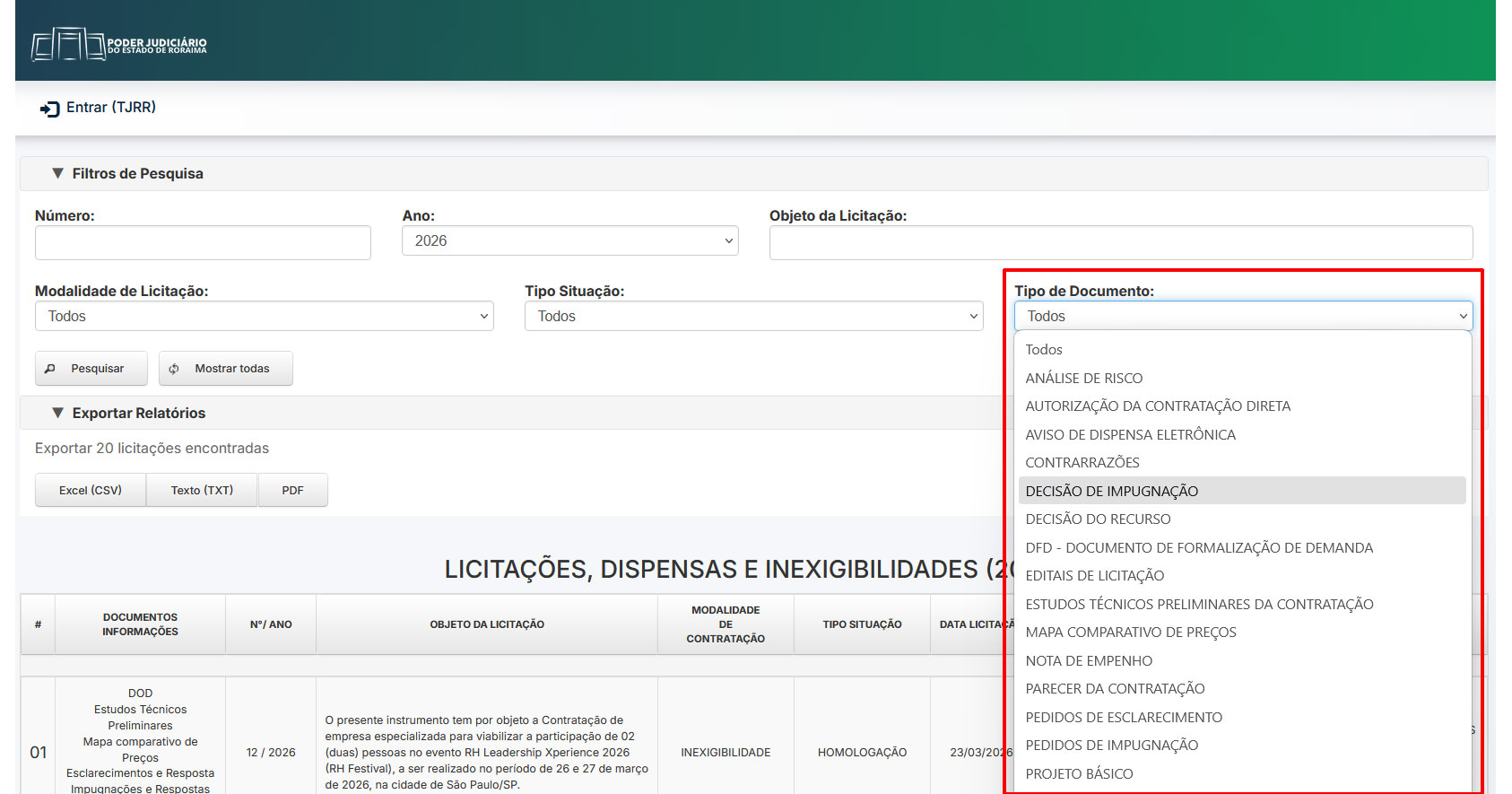 Ao acessar o sistema, no campo "TIPO DE DOCUMENTO", escolha a opção "DECISÃO DE IMPUGNAÇÃO"