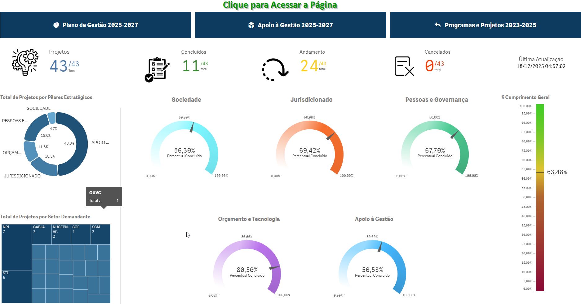 O painel exibe, de forma dinâmica, dados atualizados sobre a execução dos projetos, incluindo objetivo, entregas, status, percentual de andamento, vínculo estratégico, escopo e orçamento, além de outras informações atualizadas.